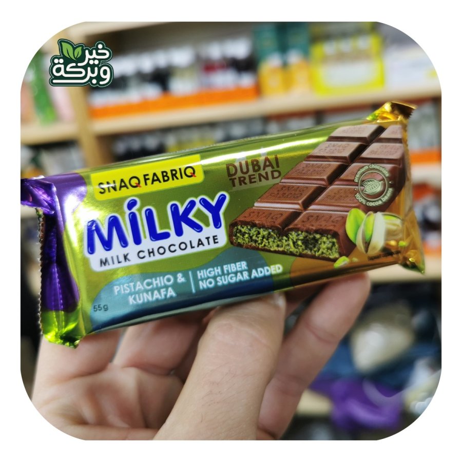 شوكولاتة دبي سناك فابرك بالحليب مع زبدة الفستق والبستاشيو المقرمشة غنية بالألياف بدون سكر 55 غم